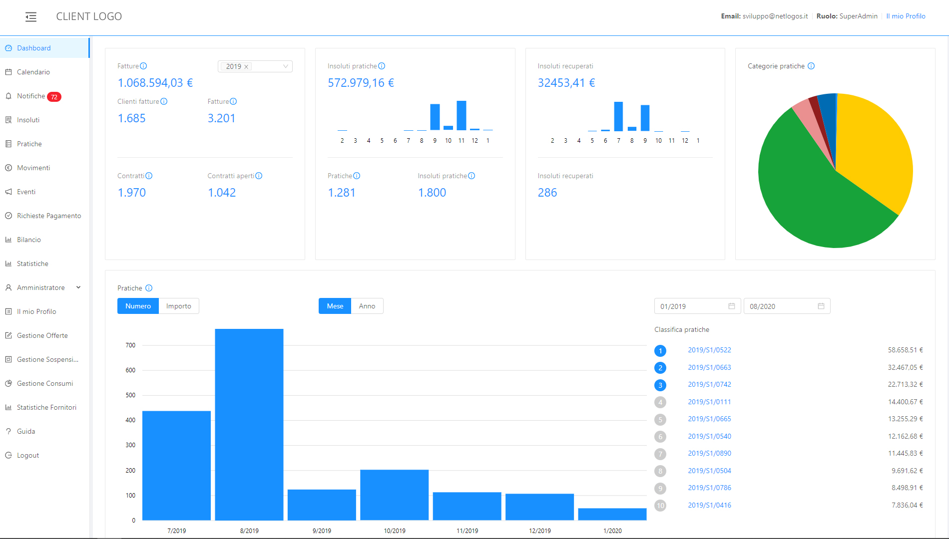 La Dashboard ha la funzione di riepilogare lo stato del recupero del credito in maniera semplice ed intuitiva. Grafici e statistiche, filtrabili per linee temporali o per importo, aiuteranno l’utente ad avere sempre sotto controllo gli insoluti e le pratiche ad essi collegate, permettendogli di navigare velocemente verso i punti di interesse.