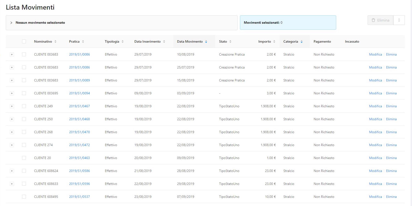 Strumento indispensabile per registrare entrate ed uscite, questa lista conterrĂ  non solo i Movimenti effettivamente avvenuti, ma anche quelle che segnalerete come presunti in futuro (es: pianificazione rientro cliente). Questi dati verranno poi utilizzati per stilare un bilancio economico.