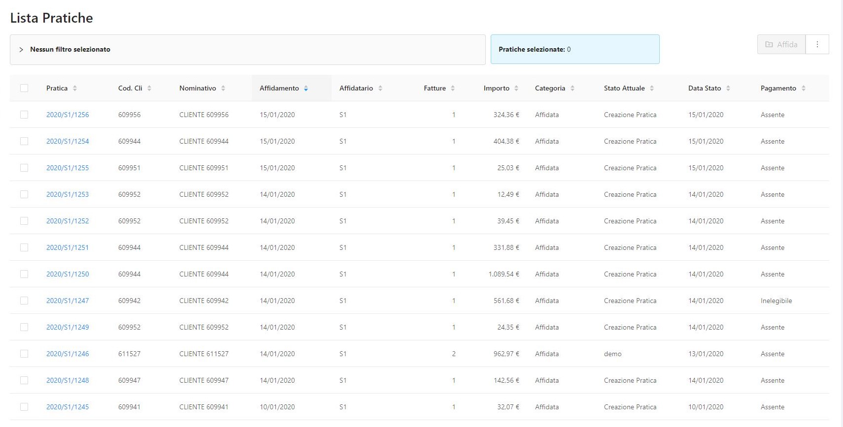 Le pratiche, qui elencate in un resoconto sintetico ma completo di ogni informazione essenziale, saranno accessibili per un monitoraggio attento e scrupoloso delle attività del recupero credito e delle varie fasi che lo interessano. Accedendo al dettaglio di ogni singola pratica sarà possibile compiere differenti azioni, come ad esempio aggiungere un nuovo stato.