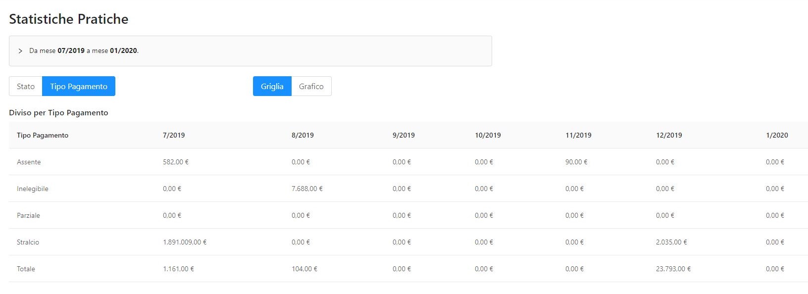 In questa sezione abbiamo una panoramica, osservabile sia in forma di griglia che di grafico, dal quale si può dedurre una statistica sul recupero credito di tutte le pratiche. Suddivisibile sia per stato della pratica che per tipo di pagamento.